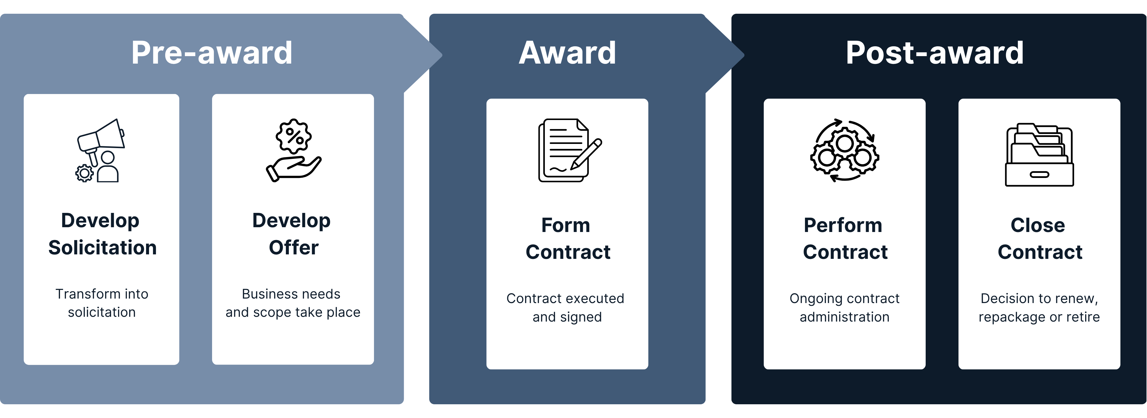 The contract lifecycle consists of three main phases: pre-award, award and post-award. Our contract management training is structured to reflect how contract management works in practice – not just in theory.
